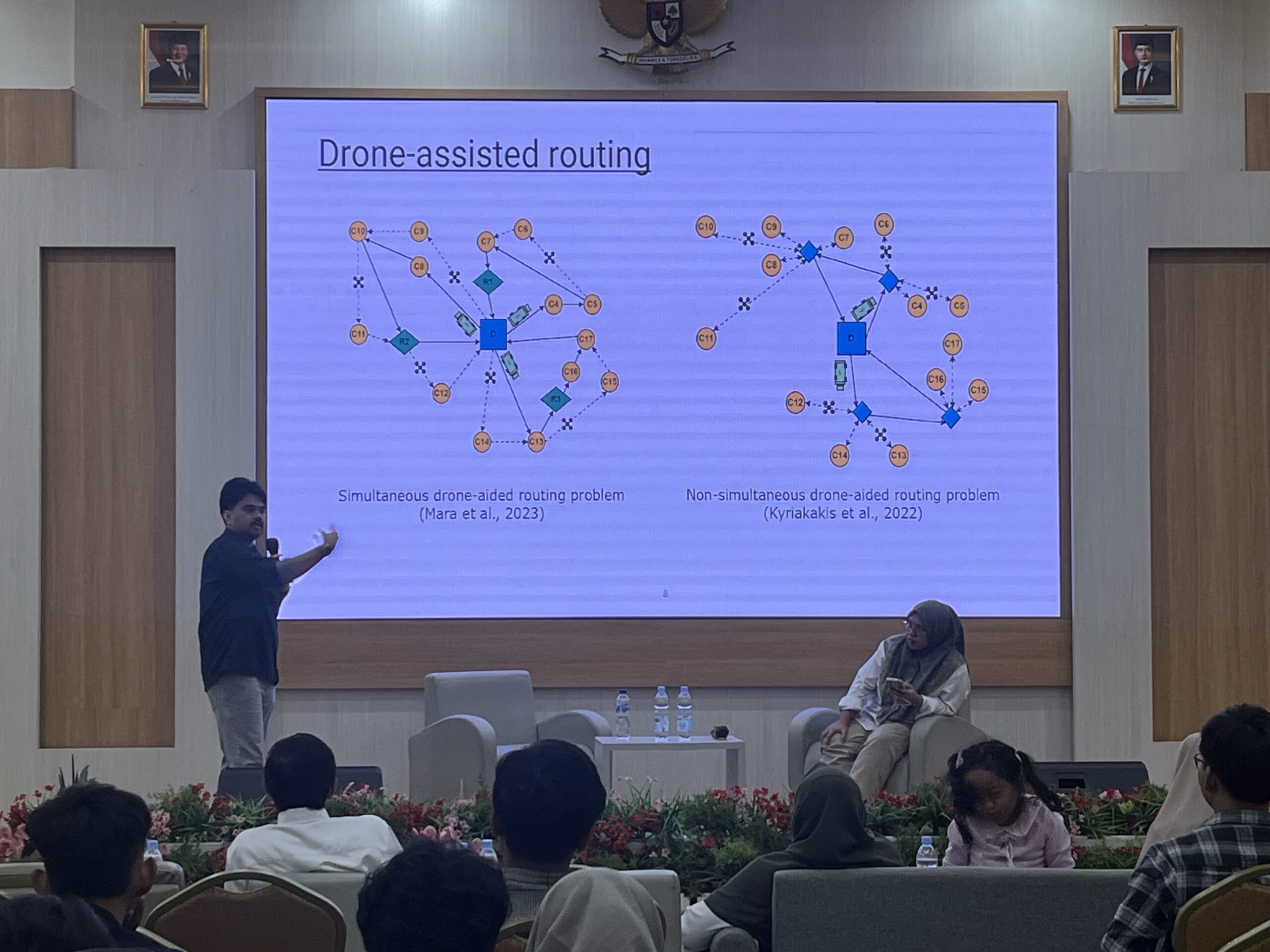 Acara ini menghadirkan narasumber internasional, Dr. Setyo Tri Windras Mara, PhD, seorang Postdoctoral Researcher di University of New South Wales, Australia. Dalam pemaparannya, Dr. Setyo membahas bagaimana pemanfaatan drone-assisted routing dan evolutionary algorithms dapat menjadi Solusi inovatif dalam mendukung operasi kemanusiaan, khususnya pada distribusi bantuan di wilayah yang sulit dijangkau.